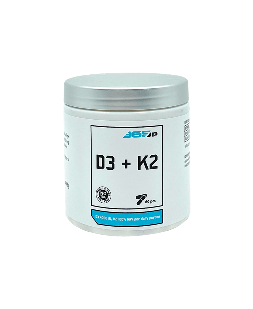 Vitaminas D3 Vitamino D3 sudėtyje yra didelė vitamino D dozė (4000 TV). Tai vienas svarbiausių vitaminų – jis veikia tinkamą daugumos mūsų organų funkcionavimą. Vitaminą D ypač svarbu vartoti rudens-žiemos laikotarpiu, o vyresnio amžiaus žmonės turėtų jį vartoti ištisus metus. Vitaminas D3 stiprina kaulus ir sąnarius, gražina odą ir prisideda prie normalios imuninės sistemos veiklos. Vitaminas K2 Kaip ir vitaminas D, vitaminas K taip pat reikalingas sveikiems kaulams palaikyti; jis pasižymi antioksidacinėmis savybėmis, kurios apsaugo jūsų ląsteles, ir yra svarbus kraujo krešėjimui. Vitaminas K1 (kuris daugiausia gaunamas iš žalių lapinių daržovių) ir K2 (kuris gaunamas iš fermentuotų maisto produktų ir gyvūninių baltymų, pavyzdžiui, organų mėsos). Didelio masto tyrimai parodė, kad vartojant dideles vitamino K2 dozes sumažėja su arterijomis susijusių ligų rizika. Šis ryšys buvo ypač stiprus žmonėms, sergantiems hipertenzija (aukštu kraujospūdžiu). Vitamino K2 galima rasti: raudonoje mėsoje, kepenyse, inkstuose, riebioje žuvyje, kiaušiniuose ir sojų pupelėse. Tačiau šiuose produktuose esančio K2 kiekis gali būti gana mažas, todėl sunku suvartoti pakankamai. Vitamino D3 + K2 komplekso privalumai: