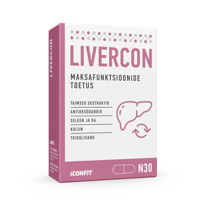 ICONFIT LIVERCON yra sudėtingas produktas, skirtas palaikyti vieno iš svarbiausių organizmo organų – kepenų – funkcijas. Produkto sudėtyje yra augalų ekstraktų, antioksidantų, cholino, vitamino B6 ir seleno.