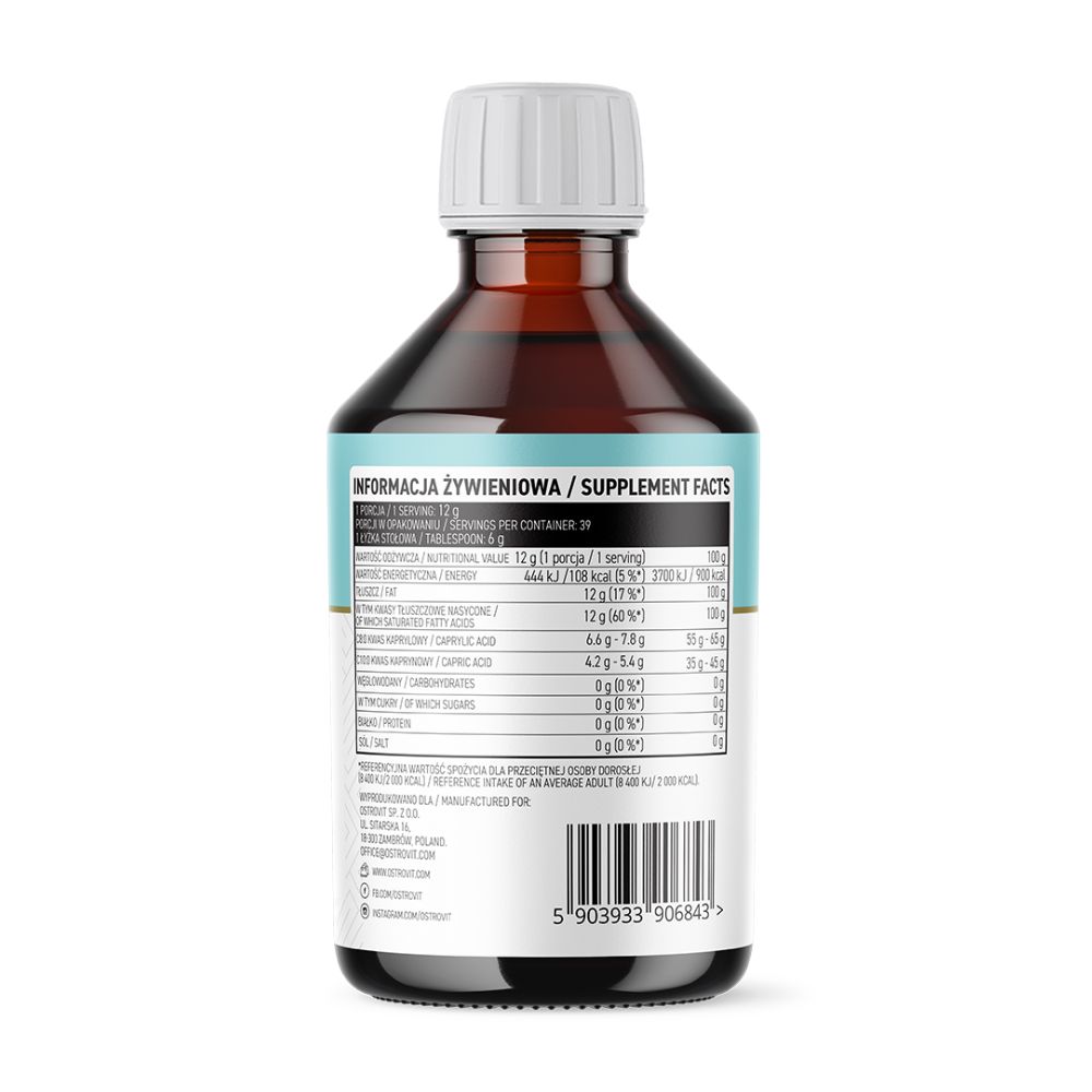MCT kokosų aliejus 500 ml OstroVit – tai vidutinės grandinės MCT riebalų rūgščių, gaunamų iš kokosų aliejaus, šaltinis. Šis produktas tiekiamas skysto pavidalo, todėl jį patogu vartoti, ir ypač rekomenduojamas sportininkams bei fiziškai aktyviems asmenims.