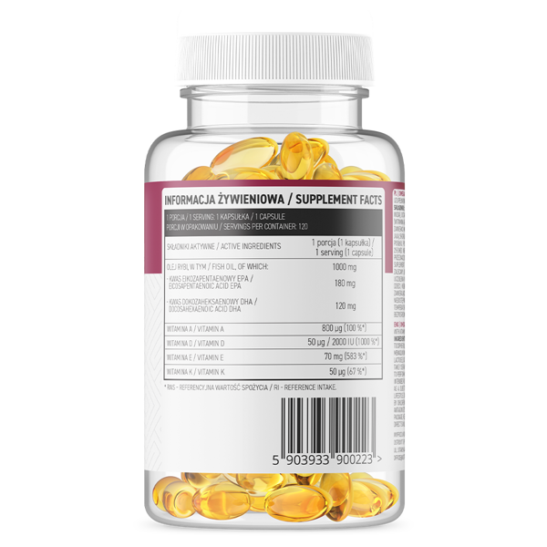 Visapusiška kasdienės sveikatos sprendimas – OstroVit Omega 3 + ADEK vienoje kapsulėje sujungia omega-3 riebalines rūgštis su fatotariomais vitaminais (A, D, E, K). EPA (180 mg) ir DHA (120 mg) yra būtinos riebalines rūgštis širdžiai ir smegenims palaikyti, o fatotariems vitaminams riebalines rūgštis yra būtinos optimaliam sugaunojimui. Galima įsigyti internetinėje parduotuvėje Omegafit.ee Pärnu mieste, Pristatymas per 1-2 dienas i Lietuva, Estija, Suomiija ir Latvija.
