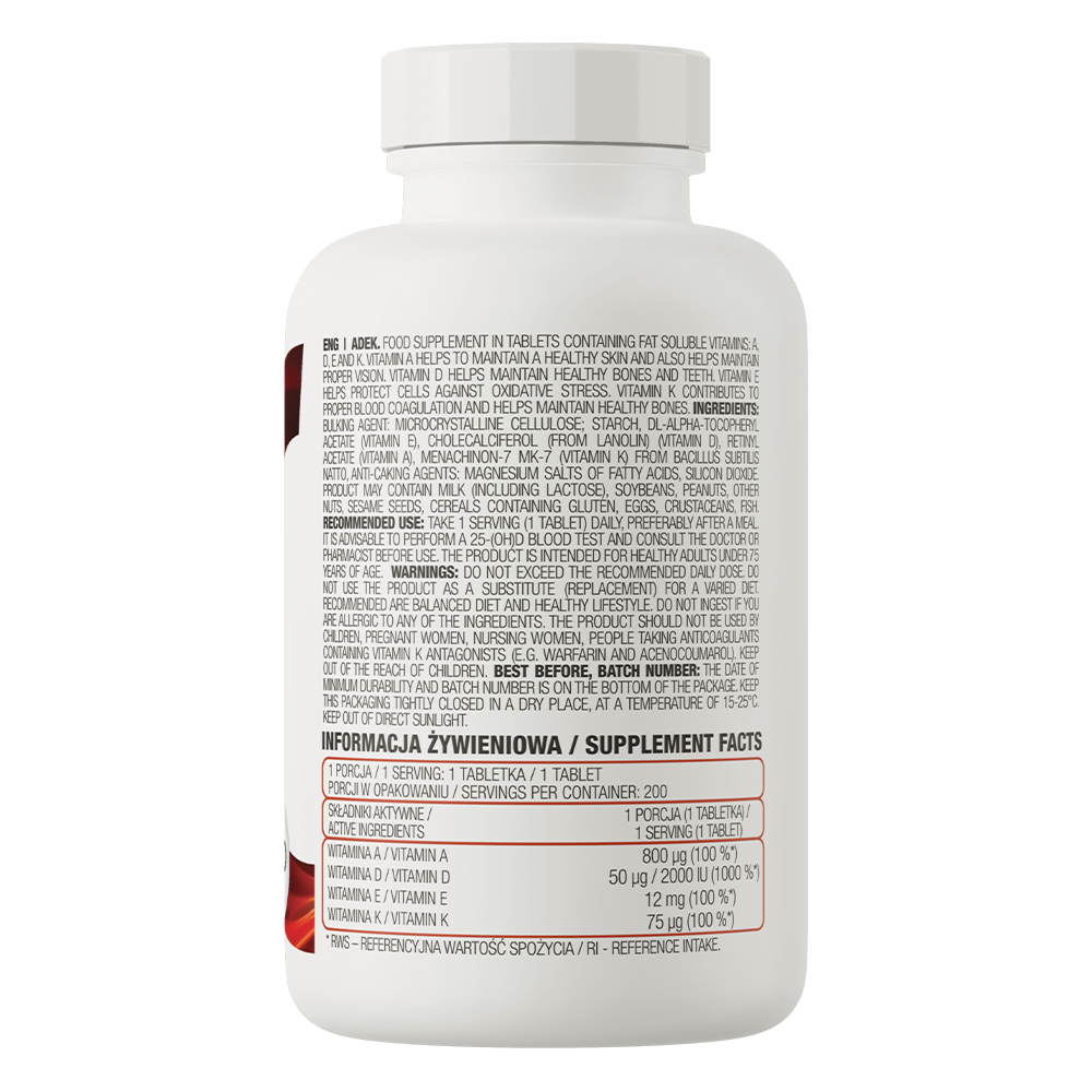 OstroVit ADEK 200“ tabletės yra maisto papildas, kurio sudėtyje yra keturi riebaluose tirpūs vitaminai: A, D, E ir K. Vitaminas A padeda palaikyti sveiką odą ir normalų regėjimą. Vitaminas D padeda palaikyti sveikus kaulus ir dantis. Vitaminas E apsaugo ląsteles nuo oksidacinio streso, o vitaminas K padeda palaikyti normalų kraujo krešėjimą ir sveikus kaulus. OstroVit ADEK“ yra išsamus kompleksas, skirtas asmenims, kuriems padidėjęs riebaluose tirpių vitaminų poreikis.