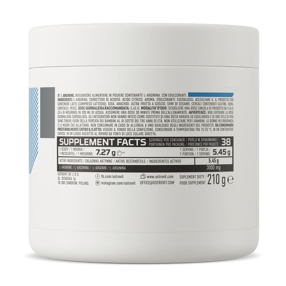 OstroVit Arginine 210g “ – sudėtyje yra L-arginino kaip ingrediento. Siekiant kokybės ir vartotojų pasitenkinimo, šis maisto papildas buvo apdorotas aukščiausiu mikronizacijos lygiu, įrodančiu jo tobulumą. Argininas yra vienas geriausių NO stiprinimo priemonių. Dėl savo savybių, kadangi argininas yra azoto oksido sintezės substratas, jis mažina kraujospūdį ir pagerina deguonies transportavimą į mūsų raumenų ląsteles. L-argininas – tai organinis cheminis junginys iš aminorūgščių grupės. Jis priklauso nepakeičiamoms egzogeninėms aminorūgštims ir dažnai klasifikuojamas kaip „santykinai egzogeninis“. Tai itin svarbi aminorūgštis, nes yra tarpinis produktas tiek karbamido cikle (kartu su L-ornitinu ir L-citrulinu), tiek azoto oksido cikle. Tai taip pat vienas iš trijų kreatino, kuris yra būtinas tinkamam organizmo funkcionavimui, formavimo substratų. L-argininas, kaip nepakeičiama aminorūgštis, yra praktiškai ir neįkainojamai naudojamas sportininkų maisto papilduose. Jis puikiai tinka naudoti jėgos ir ištvermės treniruočių disciplinose. Štai keletas svarbiausių šios „nuostabios“ aminorūgšties savybių: