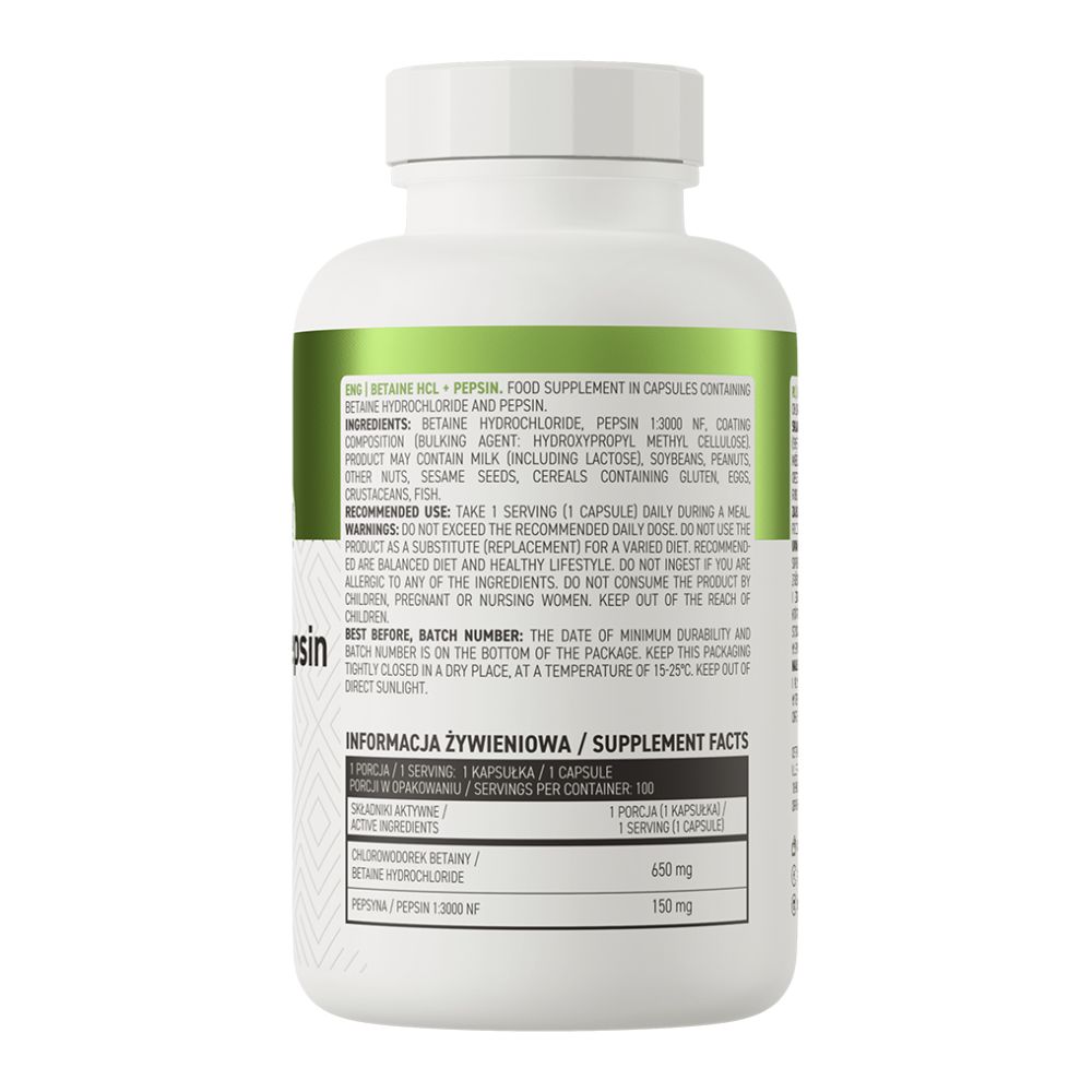 OstroVit Betaine HCl + Pepsin 100“ kapsulės yra maisto papildas, kuris yra pepsino ir betaino hidrochlorido šaltinis. Šis preparatas tiekiamas lengvai nuryjamomis kapsulėmis, skirtomis asmenims, norintiems papildyti savo mitybą vertingais ingredientais.