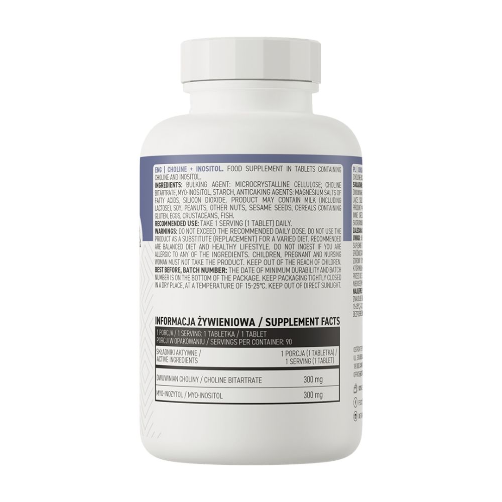 OstroVit Choline + Inositol“ 90 tablečių – sudėtyje yra du vertingi junginiai – cholinas ir inozitolis. Šis produktas tiekiamas lengvai nuryjamomis tabletėmis ir skirtas žmonėms, kuriems rūpi papildyti savo kasdienę mitybą vertingais ingredientais. Dviejų vertingų ingredientų šaltinis – viena maisto papildo porcija aprūpina organizmą 300 mg cholino bitartrato ir 300 mg mioinozitolio.
