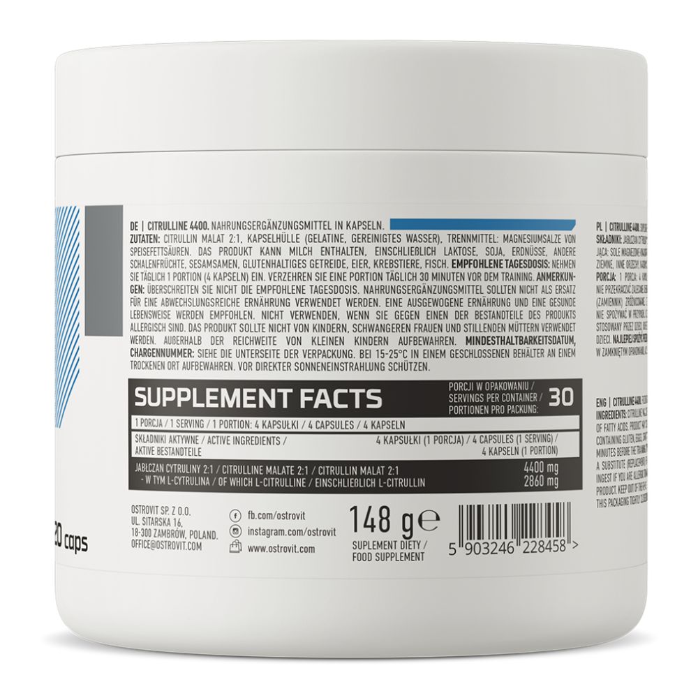OstroVit Citrulline 4400 mg“ (120 kapsulių) sudėtyje yra citrulino malato santykiu 2:1, kuris palaiko kraujotaką, deguonies pernešimą ir raumenų ištvermę fizinio krūvio metu. Padeda greičiau atsigauti po intensyvių treniruočių, 120 kapsulių pakuotėje. Galima įsigyti internetinėje parduotuvėje „Omegafit.ee“ Pernu mieste, pristatymas per 1–2 dienas visoje Estijoje.