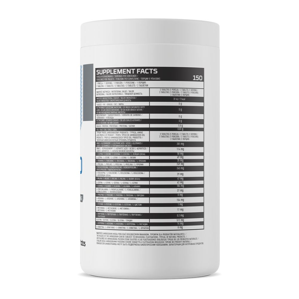 OstroVit Beef Amino 2000mg“ 300 tablečių – puikus daugelio iš jautienos gautų aminorūgščių šaltinis be nereikalingų priedų. Kiekvienoje mūsų maisto papildo tabletėje yra iki 2 g gryno jautienos baltymų hidrolizato. Produktas pirmiausia sukurtas žmonėms, gyvenantiems aktyvų gyvenimo būdą ir reguliariai sportuojantiems, kuriems būdingas raumenų irimas ir kuriems kasdienėje mityboje reikia daugiau aminorūgščių. Be puikaus aminorūgščių profilio, iš jautienos gauti baltymai skatina raumenų masės augimą ir padeda ją palaikyti. OstroVit Beef Amino 2000 mg“ – iš ko jis sudarytas? OstroVit Beef Amino“ yra sudėtingas nepakeičiamųjų ir endogeninių aminorūgščių mišinys iš aukštos kokybės jautienos baltymų hidrolizato. Kiekvienoje tabletėje yra visas spektras įvairių ir anabolinių aminorūgščių, kurias galite užtikrintai vartoti kaip vertingus jautienos baltymus, be nereikalingų riebalų ir angliavandenių. OstroVit Beef Amino“ yra maisto papildas, papildantis jūsų mitybą aminorūgštimis turtingu baltymu, kuris palaiko įvairius medžiagų apykaitos ir anabolinius procesus, įskaitant tuos, kurie būtini raumenų audinio augimui palaikyti. Papildai gali teigiamai paveikti treniruočių pajėgumą ir ištvermę. OstroVit Beef Amino 2000“ yra maisto papildas, kurį vartoja ne tik sportininkai, kuriems būdinga ciklinė treniruočių hipertrofija, bet ir žmonės, kurie yra ypač linkę į raumenų irimą ir kurių kasdienė mityba rodo padidėjusį vertingų baltymų poreikį. Tai yra visos aminorūgštys, kurias sudaro OstroVit Beef Amino 2000 mg“: