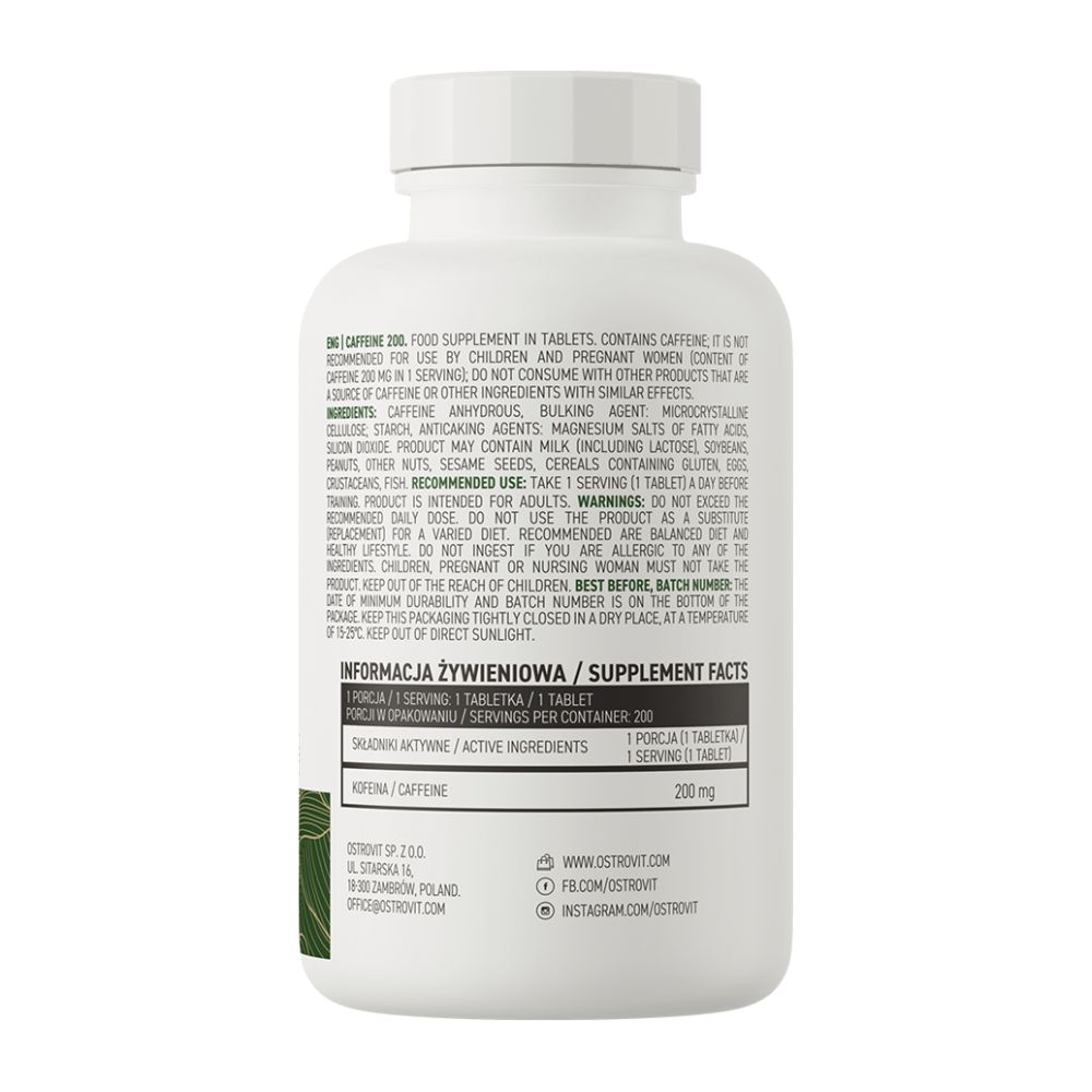 OstroVit Caffeine 200mg VEGE“ 200 tablečių – aukštos kokybės maisto papildas, kurio sudėtyje yra kofeino. Šis produktas skirtas visiems, kuriems reikia energijos. Jis ypač rekomenduojamas sportininkams, vairuotojams ir asmenims, kuriems reikia papildomos energijos studijų ar darbo metu. Vienoje tabletėje yra 200 mg gryno kofeino. Kofeinas – kaip jis veikia? Ši medžiaga vertinama dėl stimuliuojančio poveikio. Kofeinas veikia stimuliuodamas centrinę nervų sistemą, didindamas koncentraciją ir gerindamas nuotaiką. Be to, kofeinas pagreitina širdies veiklą, padidina susitraukimų jėgą ir pagreitina medžiagų apykaitą. Kofeinas pasižymi stimuliuojančiomis savybėmis, veikdamas smegenų žievę. Tai mažina nuovargį ir mieguistumą, kartu pailgindamas dėmesio koncentraciją ir gerindamas susikaupimą. OstroVit Caffeine VEGE“ ingredientų savybės: