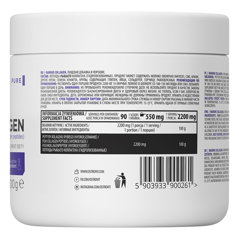 OstroVit marine collagen – vertingų žuvies kolageno peptidų šaltinis. Kolagenas yra vienas iš pagrindinių kūno struktūrinių proteinų, natūralus polimeras ir būtina gyvūnų organizmų extrapoliacinio matrikso dalis. Tai struktūrinis proteinas, sudarantis maždaug 30 % visų proteinų žmogaus kūne. Jis randamas jungiamajame audinyje, kraimtro įtakiuose, ramusiuose, odoje ir plaukų struktūroje.