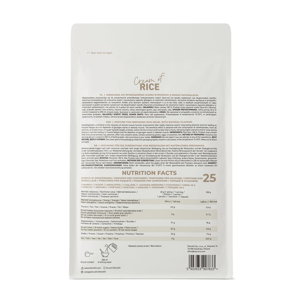 • DAUG ANGLIAVANDENIŲ – Kadangi vienoje produkto porcijoje yra net 31 gramas angliavandenių, OstroVit Cream of Rice“ puikiai tinka visiems fiziškai aktyviems žmonėms. Produkto vartojimas po treniruotės skatina glikogeno atsargų papildymą.